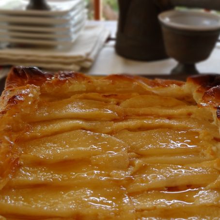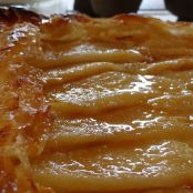 Poner las laminas de pera encima del relleno, de forma decorativa y doblar el borde de la pasta filo hacia dentro.