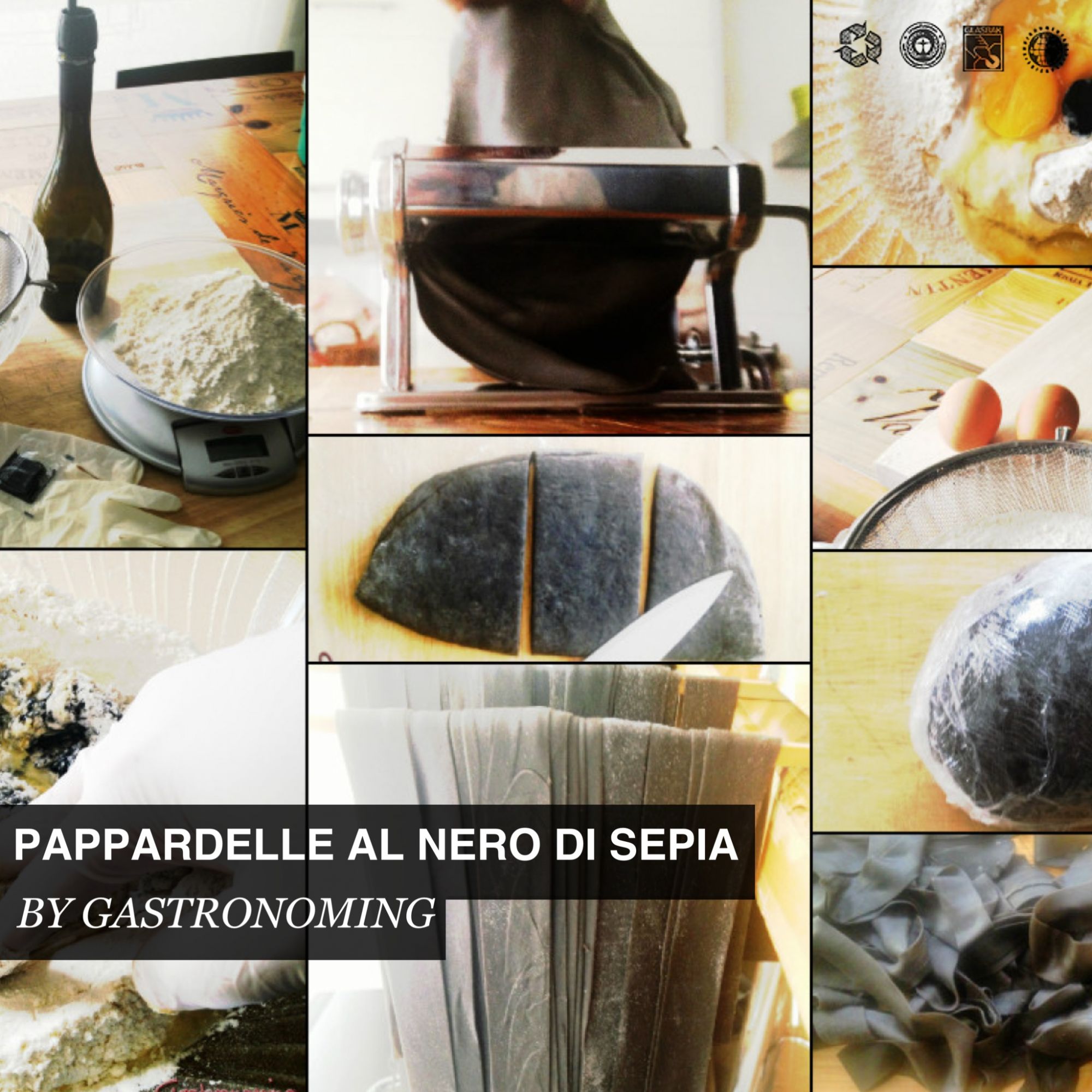 Sabiendo que al hacer una pasta fresca al huevo, la ecuación, es de un huevo por cada 100 gramos de harina, pero, la cosa cambia si hacemos pasta de algún color o de un sabor especifico, como puede ser la pasta rossa al pomodoro hecha con concentrado de tomate, pasta verde, con albahaca, perejil u otra hierba, con especias, o como es el caso al nero di sepia, hecha con tinta de calamar o sepia. Aquí la receta cambia, y sencillamente hay que quitar un huevo y añadir 4 gramos (1 sobre pequeño o una cucharada sopera rasa si la consigues en frasco) de la tinta mencionada, esto podría variar debido al tamaño de los huevos, es posible que necesites 3, pero el tema está en controlar la humedad y la harina, ni tan húmeda, ni tan seca, ir poco a poco, ya que siempre hay tiempo de rectificar, sobre todo de secar la pasta. La versatilidad de la pasta aguanta casi cualquier cosa y esto nos permite añadirle los ingrediente que más nos gusten, pero la pasta de sabores ya tiene una ventaja sobre la de huevo y es que tiene un sabor predominante, por eso, es recomendable prepararlas lo más sencillas posible, unos buenos ejemplos pueden ser al ajo, salteada con albahaca fresca, a las finas hierbas o la clásica cacio e pepe que, literalmente quiere decir queso y pimienta. El hacer tu propia pasta te permite elegir el formato del corte que prefieras, como en este caso, la pasta fresca la hemos cortado a cuchillo para hacer unos pappardelle, unos fettuccine anchos que miden entre 2 y 3 centímetros de ancho. No olvides dejar reposar la masa y luego, una vez hecha la pasta, dejarla airear y secar un poco, luego, el tiempo de cocción será casi inmediato, de 1 a 3 minutos como mucho. Es más fácil de lo crees, pon las manos en la masa y a trabajar. Una cosa si te recomiendo, si haces esta receta, usa unos guantes de vinilo o nitrilo aptos para alimentación si no quieres quedar con las uñas negras un buen tiempo.