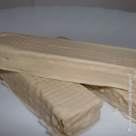 Lo primero que haremos es triturar las avellanas en una picadora. Despues se las añadimos a la crema de avellanas blanca. Untamos las obleas, vamos haciendo capas. Dejamos la ultima la que va encima sin untar. Las metemos en el frigorífico una media hora para que sean mas manejables. Partimos cada oblea en tres trozos. Derretimos el chocolate. Ahora toca bañar cada huesitos en el chocolate y los dejamos en el frigorífico mas o menos una hora, para poder manipularlos mejor.
