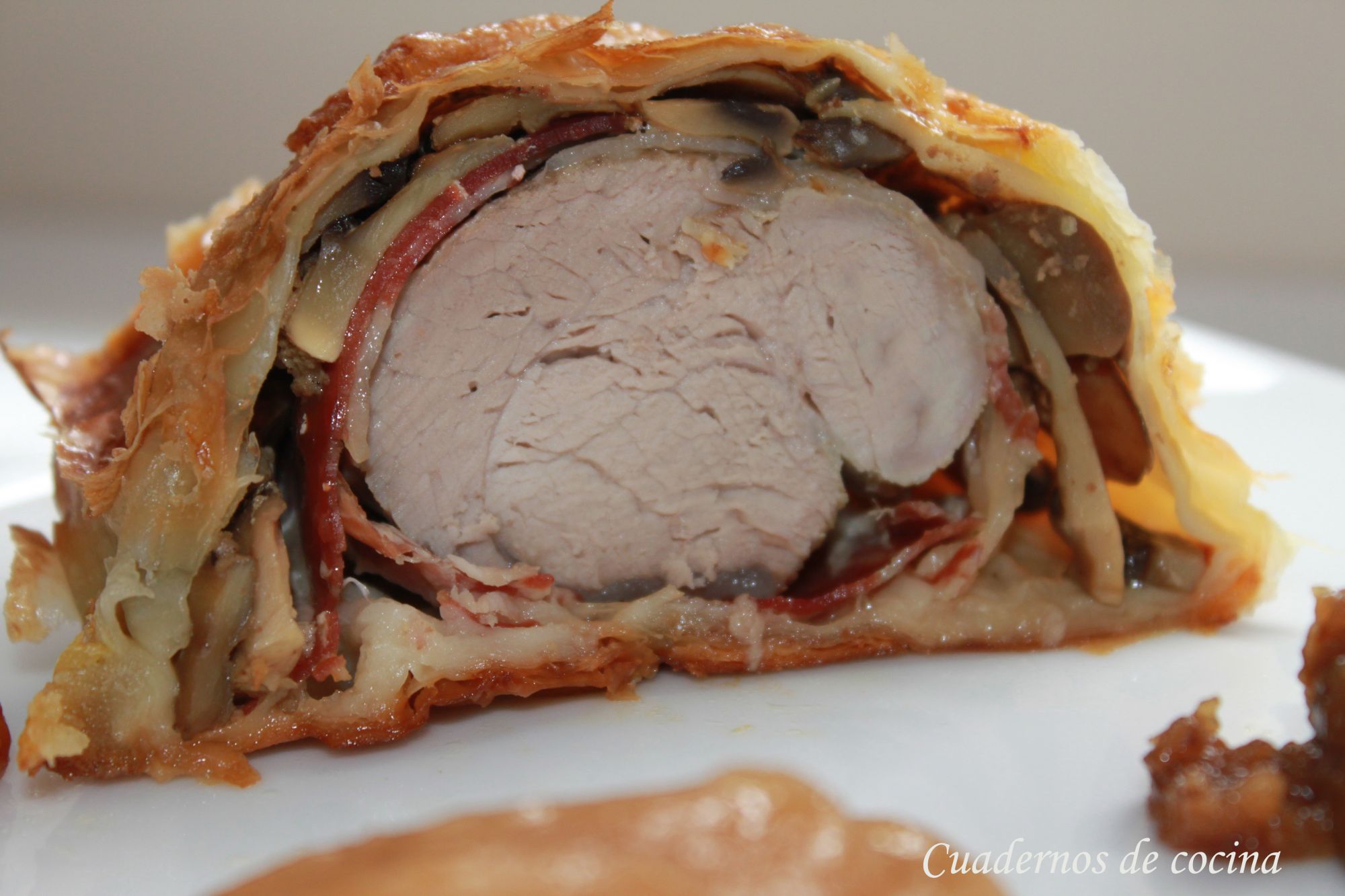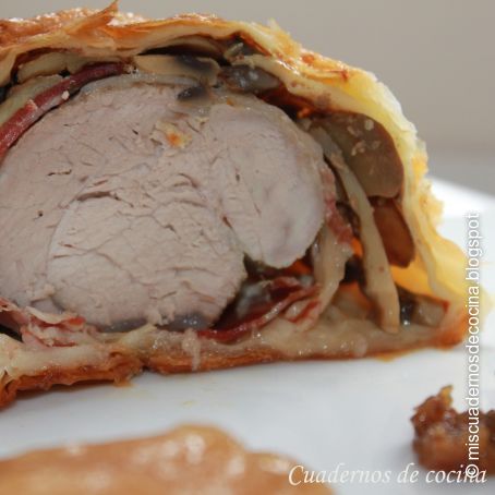 Untar el centro con un poco de paté (opcional). Colocar encima una cama de champiñones y las lonchas de jamón. Ponemos centrado y encima de todo el solomilo.