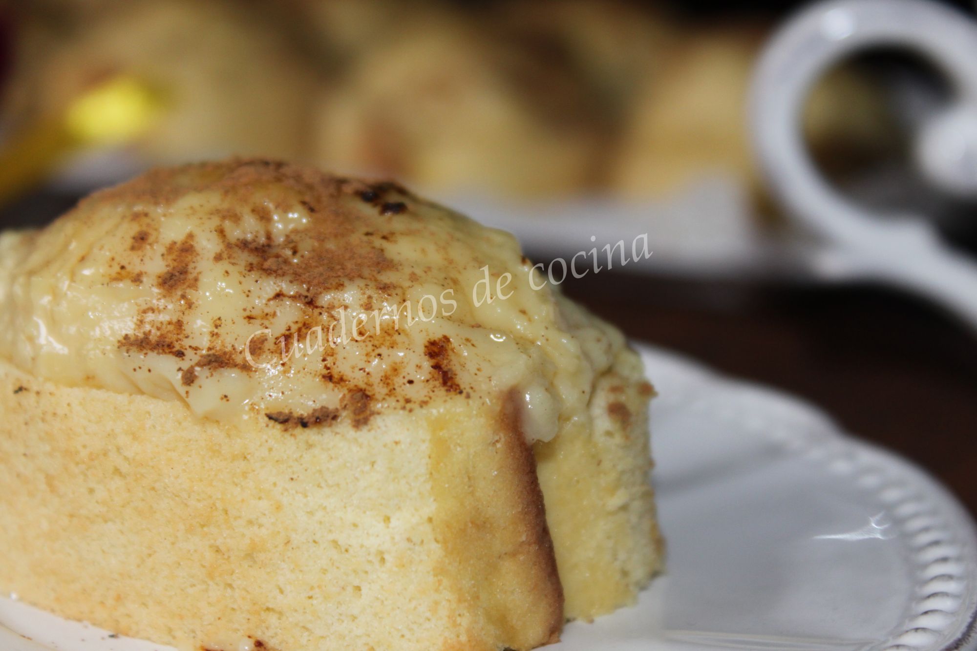 Dejamos templar y con ayuda de un pincel, emborrachamos toda la plancha con el almíbar reservado. Ponemos a continuación una capa de crema (poca cantidad y extendemos bien). Enrollamos como si fuera un brazo de gitano y cortamos porciones de unos tres o cuatro cm..