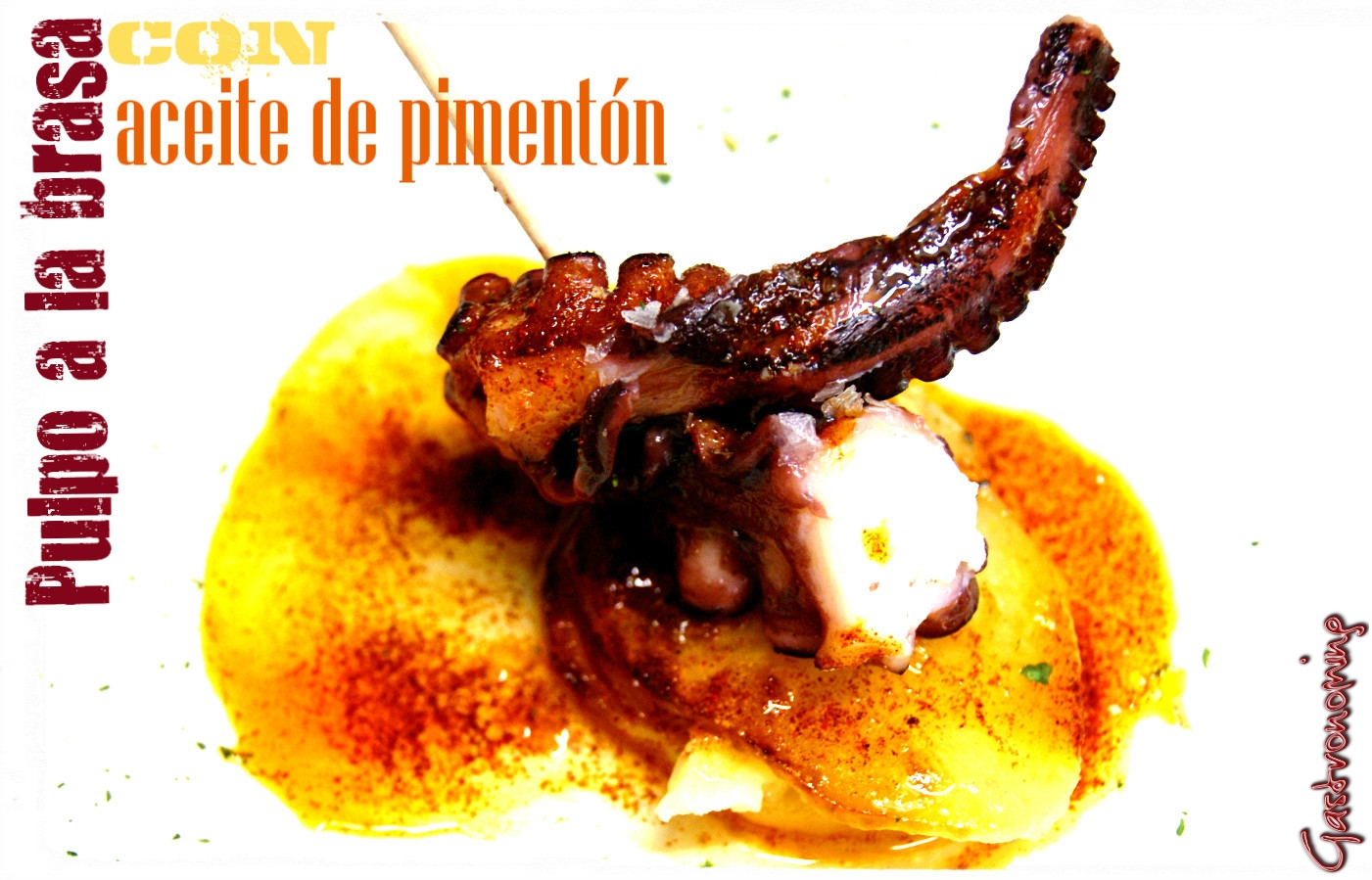 Podemos espolvorear, perejil fresco por encima o unos ajos fritos, es un plato muy sencillo y sabroso, incluso hoy en día podemos comprar las patas de pulpo ya cocidas, eso hace de esta tapa, una solución para emergencias. También lo podemos hacer como un plato. Si no quieres sentir el granulado del pimentón, puedes tamizar el aceite después de enfriar una vez hecha la infusión de pimentón.