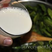 Ahora echa uno de los dos vasos de leche, y bate hasta soltar todos los grumos, entonces añade las espinacas, si no caben todas a la vez, espera a que reduzcan un poco el tamaño y echa las que faltan.