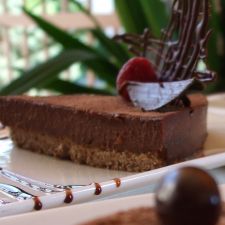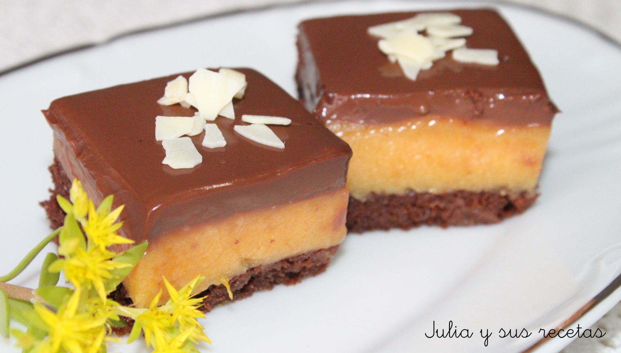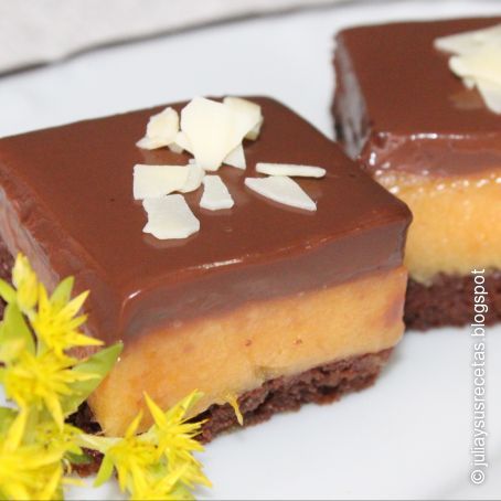 Desmoldamos la tarta y la cortamos en cuadraditos y la adornamos con virutas de chocolate.