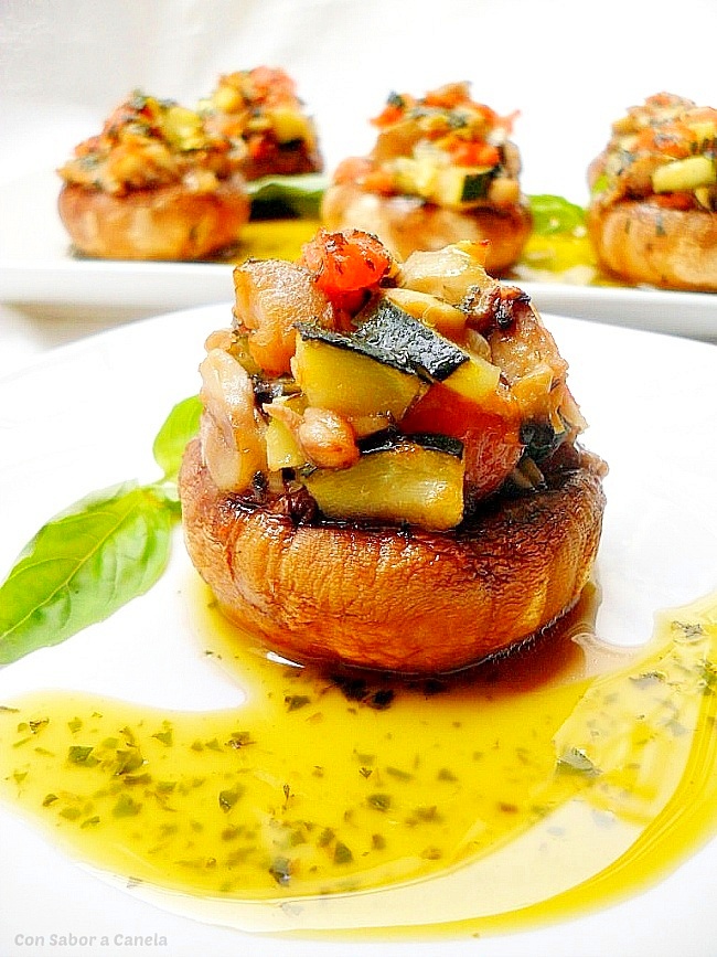 - Salpimentamos ligeramente los sombreros de los champiñones, los regamos con el zumo del limón para evitar que se oscurezcan demasiado durante la cocción, y seguidamente los rellenamos con el salteado de verduras.