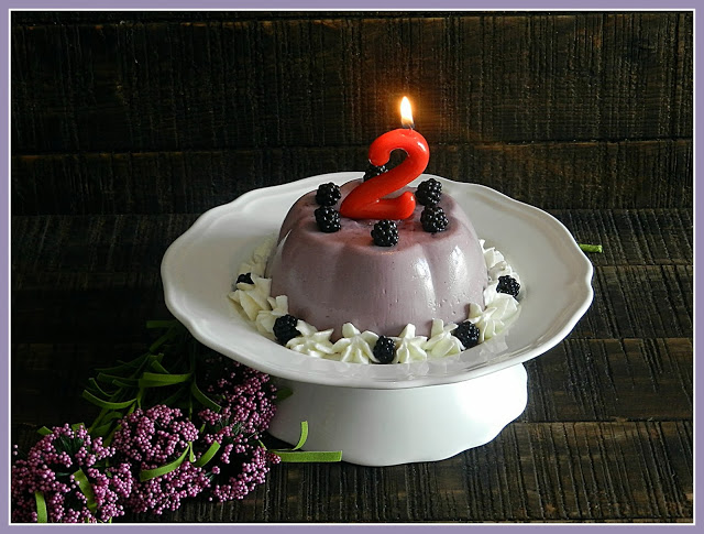 Montamos la nata con dos cucharadas de azúcar y decoramos haciendo una cadenita de flores de nata alrededor de la pannacota. Añadimos también las moras enteras que habíamos reservado.