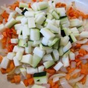 Cortamos mientras la cebolleta en tiras, los dientes de ajo en láminas, la zanahoria en daditos y el calabacín en cubos. En una sartén ponemos un poco de aceite de oliva y sofreimos el ajo y la cebolleta. Cuando empiecen a cambiar de color añadimos la zanahoria y tras cocinar un minuto, incorporamos el calabacín.