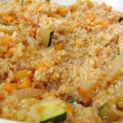 Damos unas vueltas y cuando el calabacín empiece a ponerse transparente incorporamos el tomate triturado. Mezclamos bien, bajamos el fuego y rectificamos de sal dejándolo cocinar durante 5 minutos, removiendo de vez en cuando. Cuando el tomate esté cocinado incorporamos la quinoa removiendo bien para que queden integrados todos los ingredientes.