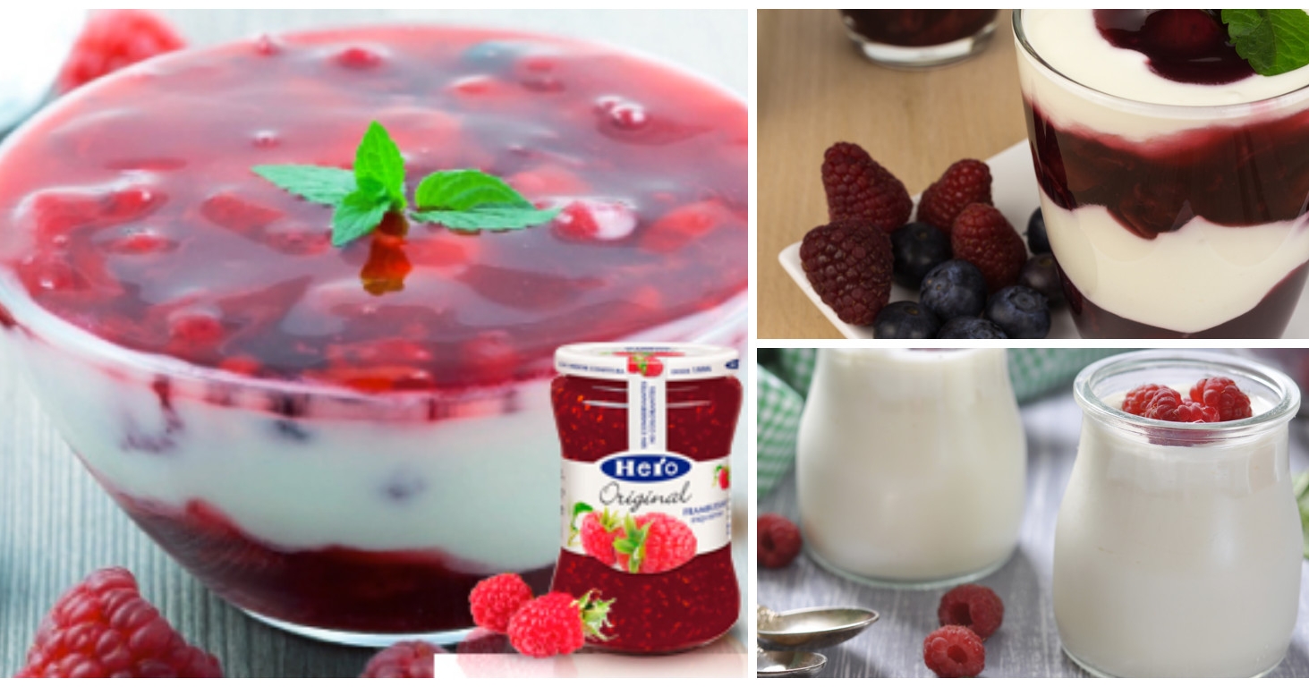 En el fondo de los recipientes en los que vayamos a presentar el postre, echamos parte de las frambuesas y una generosa capa de Mermelada Hero Original de Fambuesa. A continuación, vertemos la mezcla de la cuajada y dejamos enfriar, primero a temperatura ambiente y luego en el frigorífico.