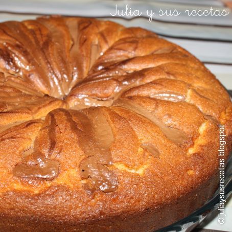 Enmantequillamos un molde y ponemos la masa. Calentamos un poquito la Nocilla en el microondas para que sea mas manejable y vamos poniéndola por encima formando rayos como las ruedas de una bicicleta. La cantidad que pongamos depende del gusto,mas o menos, según nos guste, aunque cuanto mas lleve mejor, pero sin pasarse.