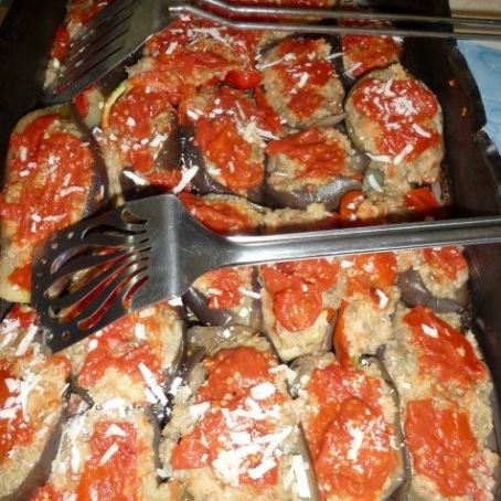 8. Y con ella rellenamos las berenjenas y las colocamos en la bandeja.