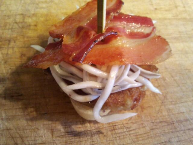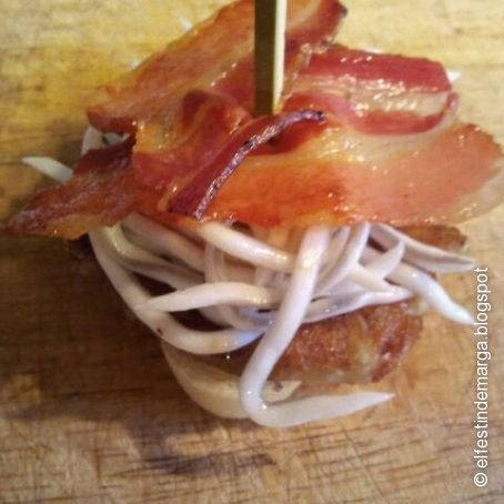 Montamos sobre cada trozo de berenjena, una cucharada de gulas y un par de trozos de panceta. Ponemos sobre una rebanada de pan y pinchamos con un palillo. Ya veréis que rico.