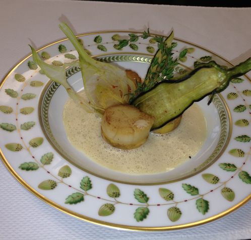 Una crema con fina textura, caliente y suave. Con un toque almendrado que le dan los piñones y la berenjena que combina muy bien con el sabor de las vieiras. Y para rematar el plato la textura crujiente de las verduras.