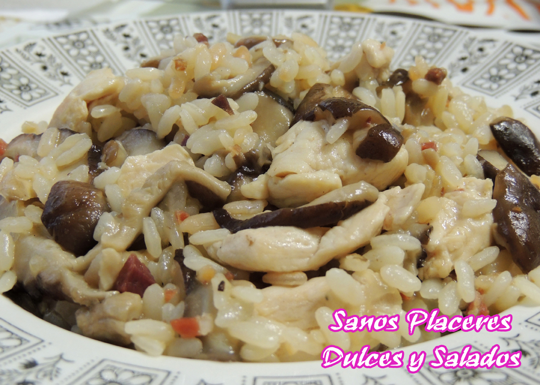 Cuando veamos que el arroz ha cogido un poco de volumen, le añadimos un chorro de vino blanco, los hongos o setas, las pechugas hechas y el jamón.