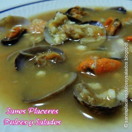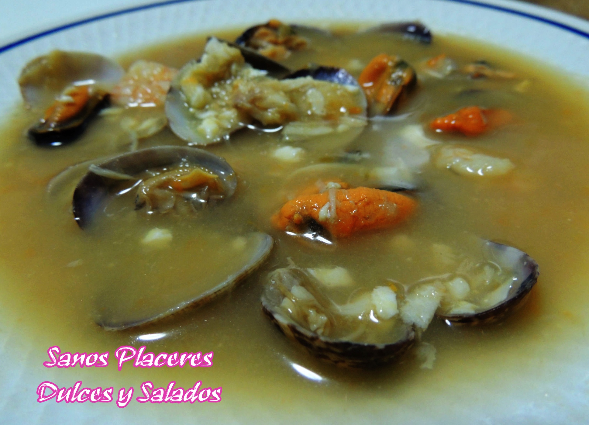 Ponemos todo el caldo (puré de verduras + huevo picado + caldo de la cocción + una copita de coñac) en una cazuela grande y le agregamos, primero el pescado desmigado, luego los mejillones sin cascara, las gambas congeladas y finalmente las almejas sin cocer (se nos abrirán dentro del caldo).