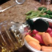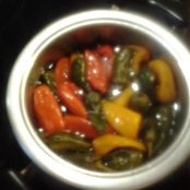 En una cacerolita de fondo grueso, colocar los pimientitos rojos y amarillos que en general son más duros que los verdes. Cubrirlos con aceite de oliva y ponerlos en el fuego en el n° 6 sobre 9 dos minutos, bajandolo al n° 2 durante 15/20 m. tapados No debe freir, solo burbujear (unos 60/70 grados).