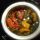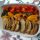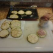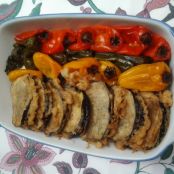 discos de berenjenas rellenos de paté de la sierra de Cameros, albardados y con pimientos confitados
