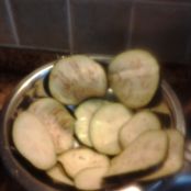 Cortar las berenjenas en rajas finas, desechando las puntas. Ir colocandolas en un recipente por tandas, espolvoreadas de sal, para que expurguen el agua amarga.
