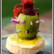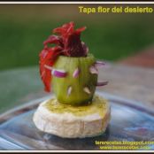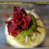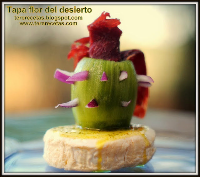 Corta la cebolla en juliana y luego vuelves a cortar las puntas en piquitos de un centímetro de largo, con un pincho perfora el cuerpo del kiwi e introduce los trocitos de cebolla simulando las espinas de un cactus.