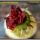 Ahora echa la salsa pesto sobre el rulo de queso de cabra y pon encima la fruta ya decorada...