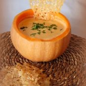 Una crema de calabaza con un toque de naranja y una peineta que queso parmesano crujiente