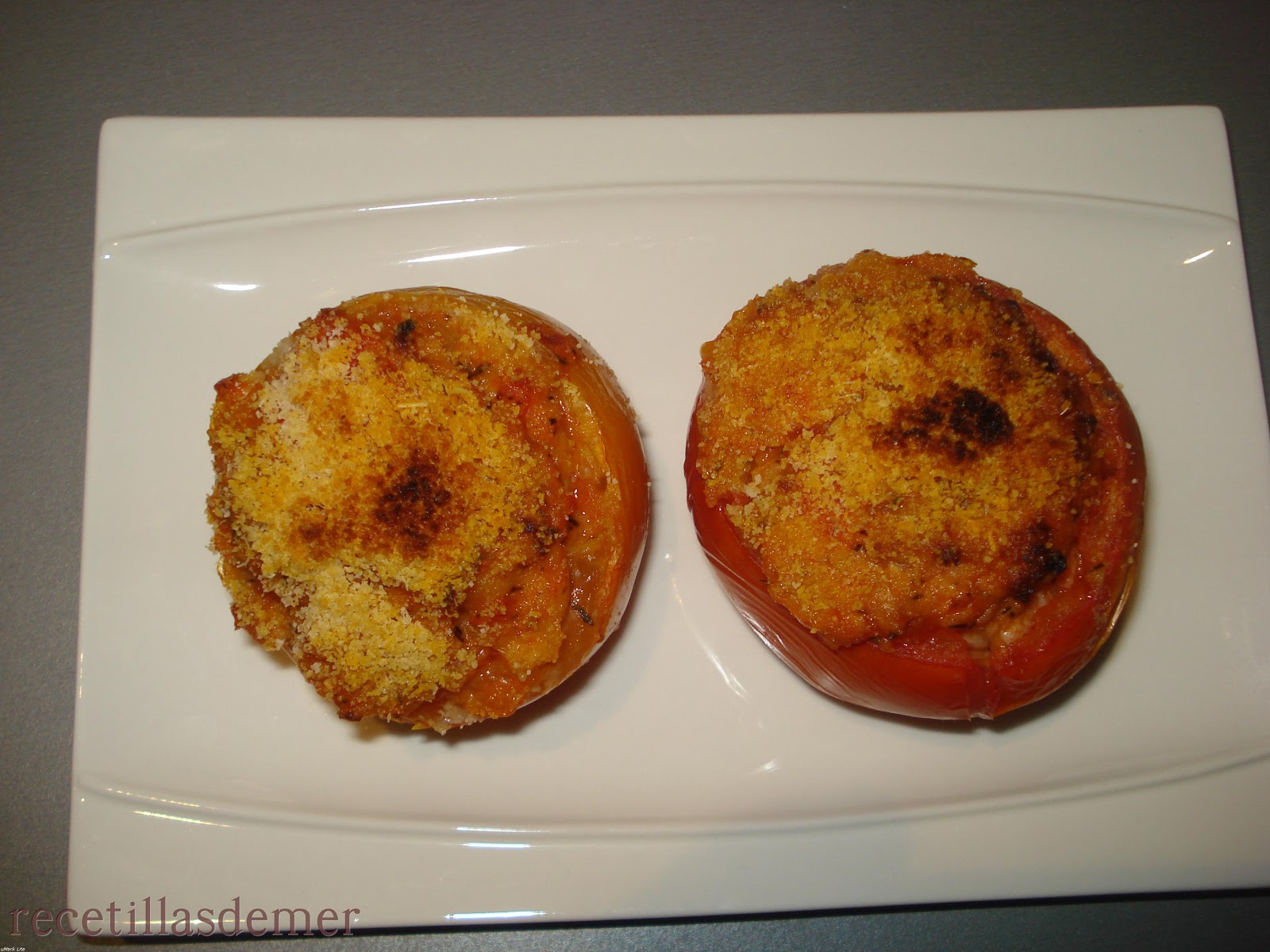 Dejar que enfríe y después rellenar con una cuchara o cucharilla los tomates. Espolvorear por encima una mezcla del pan rallado y el queso. Si no tenéis queso podéis poner todo con pan rallado.
