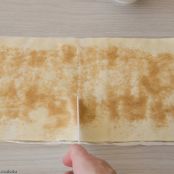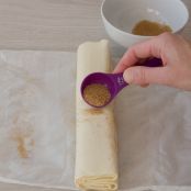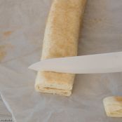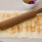 Al principio tenéis dos opciones: esparcir azúcar sobre la mesa de trabajo, colocar encima la placa de hojaldre estirada y pasar el rodillo suavemente por encima para que el azúcar se adhiera a la masa.