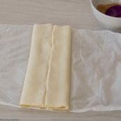 Doblar la esquina izquierda del hojaldre ( podemos ayudarnos del papel )y llevarla hacia el centro, debe coincidir con la linea que habíamos hecho con el cuchillo. Repetir la operación con el lado derecho.