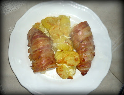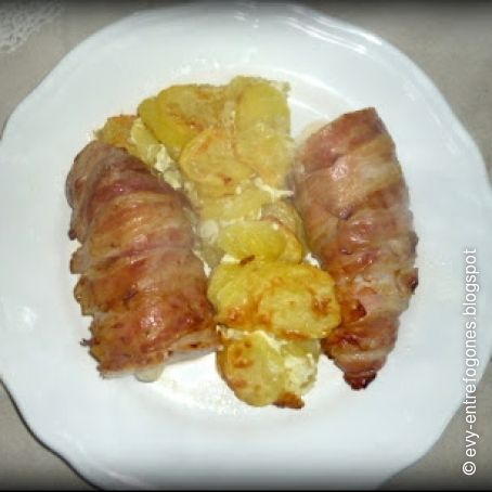 Solomillo envuelto en bacon con patatas gratinadas con creme fraiche