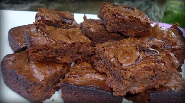 Vertemos sobre el molde la mitad de la mezcla (el mío cuadrado de 20 centímetros) e incorporamos la mitad del dulce de leche, removiendo con un palito para que se integre por todo. Echamos el resto de la mezcla y de nuevo dulce de leche, volviendo a remover. Nivelamos la superficie y horneamos unos 20 minutos, hasta que esté firme y brillante.
