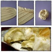 Pasado ese tiempo sacamos la masa a la encimera, cogemos porciones y las estiramos, les hacemos unos cortes, las enrollamos y luego otra vez sobre si mismas (como en las fotos).