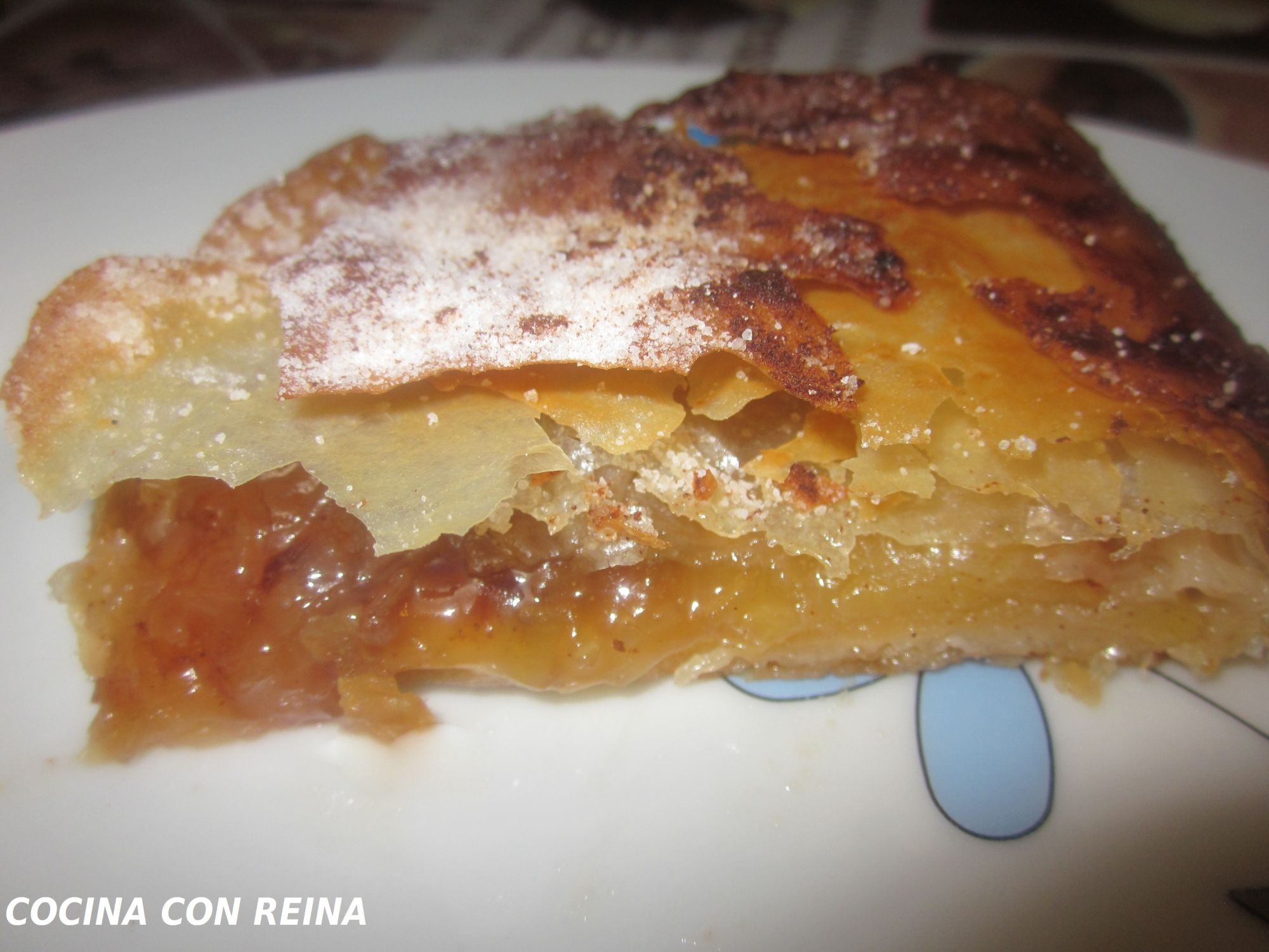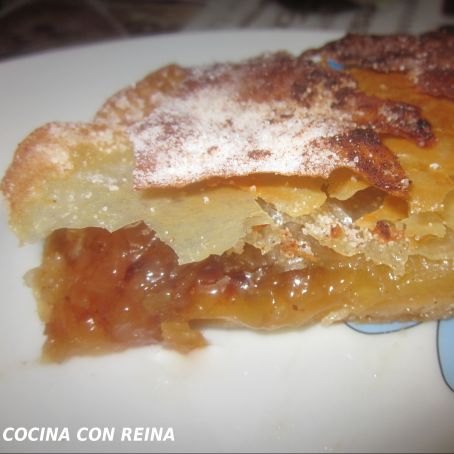 Pelamos las manzanas y las cortamos en trocitos, la ponemos encima de la masa, junto con el cabello de ángel y en azúcar