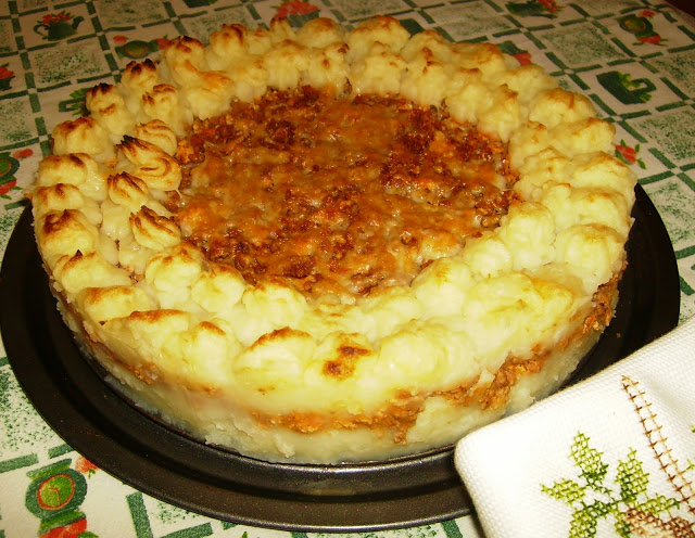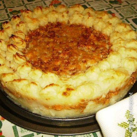 Coger un molde redondo desmoldable, poner un capa de puré de patata y otro de carne, echar queso rallado, con un poco de puré que habremos reservado, hacemos unos rosetones con ayuda de una manga pastelera. Ponemos al horno en la función gril (solo gratinar) hasta que esté dorado.