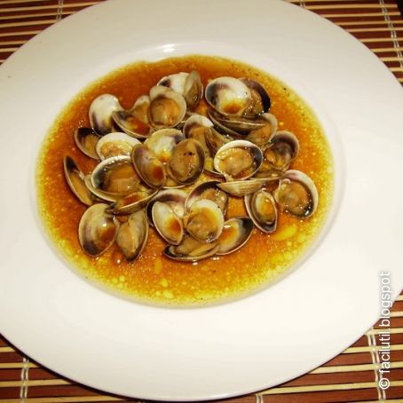 2-Poner a calentar una sartén con un poco de aceite, echar las almejas lavadas y escurridas. Poner una tapadera para que se abran al vapor.