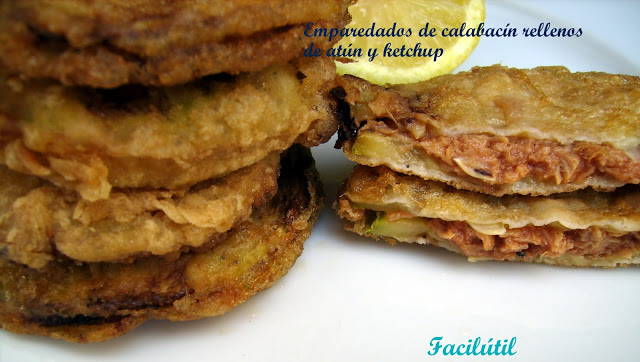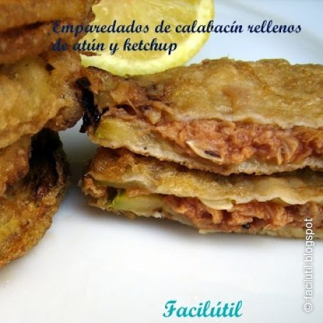 Mezclar el atún escurrido con un poco de ketchup, poner una cucharada en una rodaja de calabacín y tapar con otra, hacer lo mismo con todas. Pasarlas por harina, huevo batido y freir en aceite caliente.