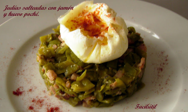 Judías salteadas con jamón y huevo poché