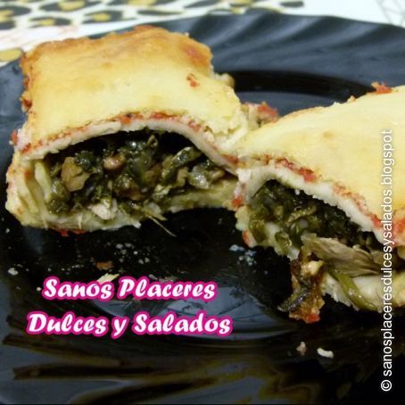 En un sartén con aceite de oliva, rehogamos la cebolla. Cuando esté dorada, le añadimos las nueces, las espinacas escurridas, el bonito (o atún) desmenuzado, dos cucharadas soperas de la bechamel que hemos reservado y un poco de agua. Removemos todo bien y dejamos a fuego medio hasta que toda el agua se evapore. Luego, retiramos del fuego y dejamos enfriar.