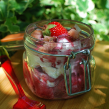 Hacemos la crema de queso poniendo los quesos y la nata en el vaso de la batidora y triturándolo todo. Rellenamos los vasitos hasta la mitad.