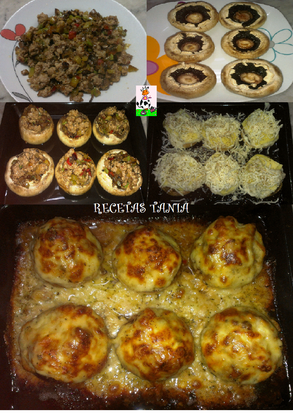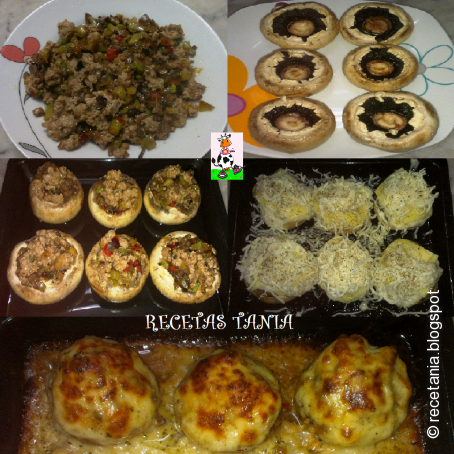 En una sartén freímos las cebollas y los pimientos que tendremos picaditos hasta que quede pochado, añadimos el calabacín, el puerro bien picadito, la carne picada y el picado del centro de los champiñones, un poquito de sal, pimienta negra, orégano y tenemos todo en el fuego hasta que la carne esté hecha.