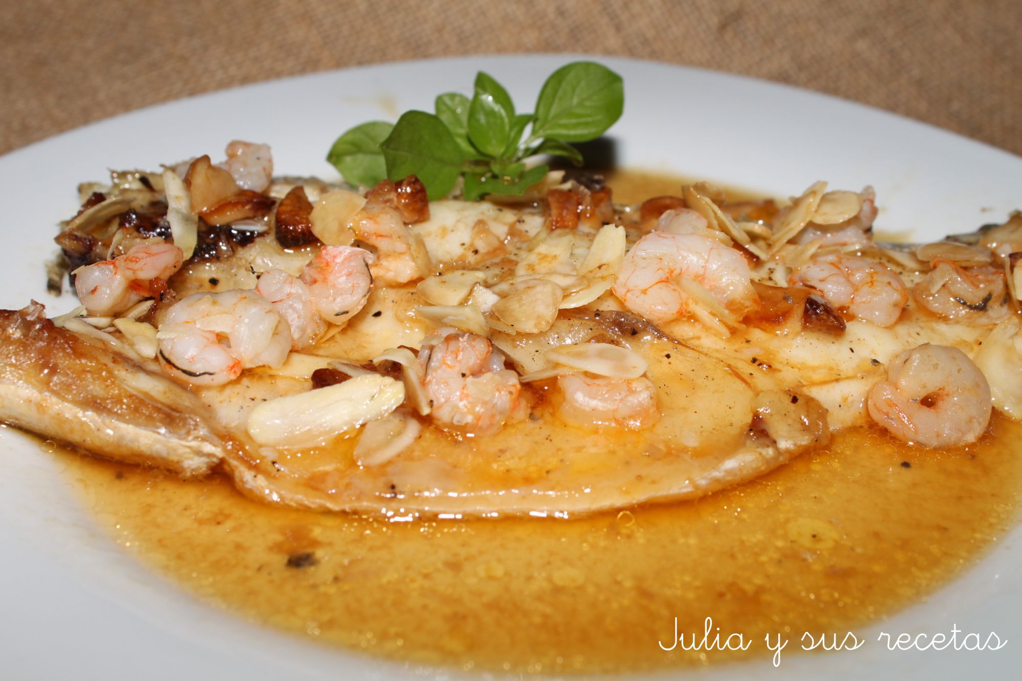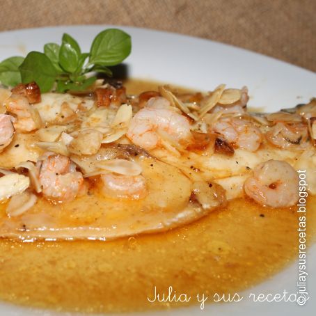 Se mete al horno y se asa durante 7-8 minutos a 180º. Se saca y se le pone encima las gambas y las almendras laminadas, se vuelve a meter en el horno 2-3 minutos mas.