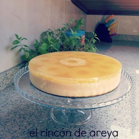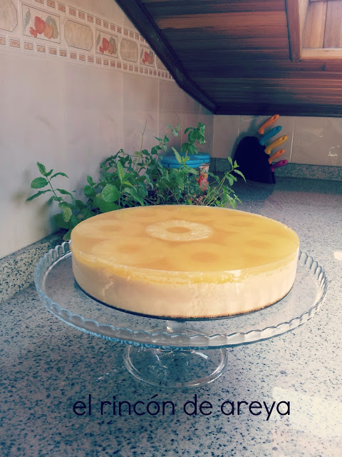 Una vez frío colocamos las rodajas de piña para adornar. Hervimos el zumo de piña con el sobre de Agar Agar y el azúcar.Vertemos por encima de la piña y dejamos enfriar a temperatura ambiente. Luego metemos en la nevera hasta que esté bien fría