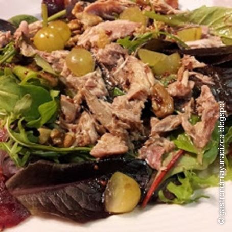 Una vez haya perdido el agua ponemos sobre un plato un fondo de lechuga, a continuación agregamos el jamón serrrano, las bayas de uvas y las nueces.