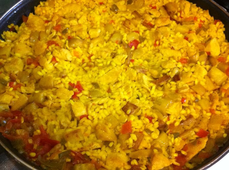 En la misma paellera ponemos el agua a calentar cuando comience a estar caliente agregamos el arroz y la sal al gusto. Dejamos cocinar cuando haya evaporado la mitad del agua agregamos las verduras repartidas por toda la paellera, agregamos también el azafrán y la pizca de nuez moscada.