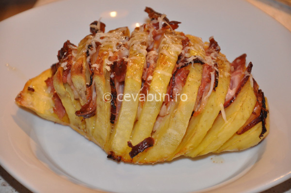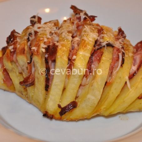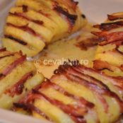 Después de 15-20 minutos, las rodajas de patata empiezan a estar lejos el uno del otro, retire las papas del horno y se interpone entre los puntos de las rebanadas de tocino.