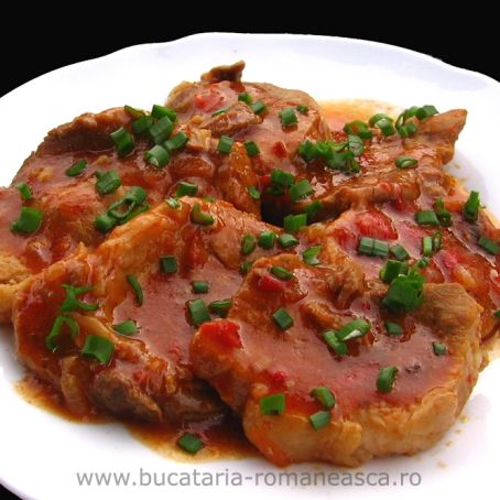 La carne se corta bien. En una cacerola poner en aceite caliente, añadir las rodajas y se deja freír por ambos lados. Agregar el agua caliente y cubrir la sartén con una tapa. Deje que se cocine a fuego lento. Después de unos 10 minutos, añadir las verduras y guiso de vino. Deje que se cocine a fuego lento durante unos 40 minutos. Cuando la salsa se haya reducido y la carne esté cocida añadir la sal, la pimienta y el romero al gusto. Puede usar la pimienta y granos de pimienta. Steak es puesta en una bandeja de servir.
