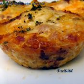 Llenar los moldes que pueden ser de las magdalenas, poner el queso rallado por encima y un poquito de orégano. Meter al horno precalentado a 180 grados unos 15 minutos o hasta que al pinchar con una aguja, esta salga limpia.