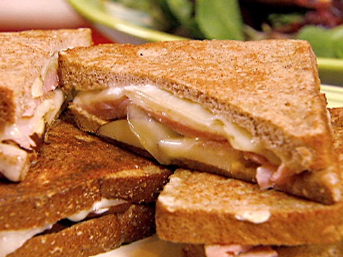 En una sartén, agregue mantequilla, caliente a burbujear, y dore los sándwiches con bastante lentitud a fuego bajo, 2 a 3 minutos por cada lado, hasta que el queso se derrita. Añadir más mantequilla según sea necesario. Para los aperitivos, cortar el sándwich en cuartos u octavos.
