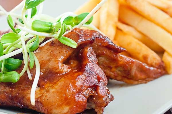 Pollo al horno glaseado con miel de maple y puré de papa