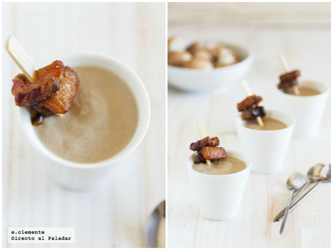Para preparar los pinchos de tocino caramelizado precalentamos el horno a 180 grados con grill. En un bol mezclamos el azúcar con el pimentón. Cortamos el tocino en tacos como de dos centímetros y los rebozamos en la mezcla de azúcar hasta que estén bien impregnados, los horneamos durante seis minutos hasta que estén tostaditos. Los insertamos en una mini brocheta para acompañar la crema.