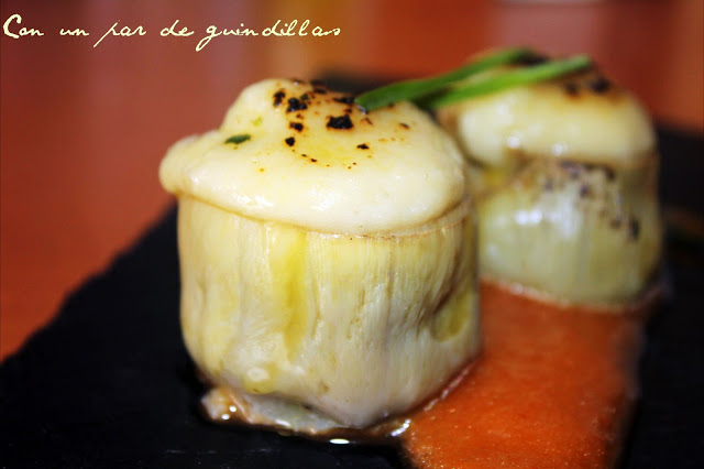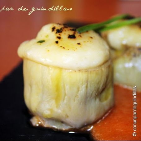 Alcachofa rellena de brandada de bacalao gratinada con salsa de pimientos rojos